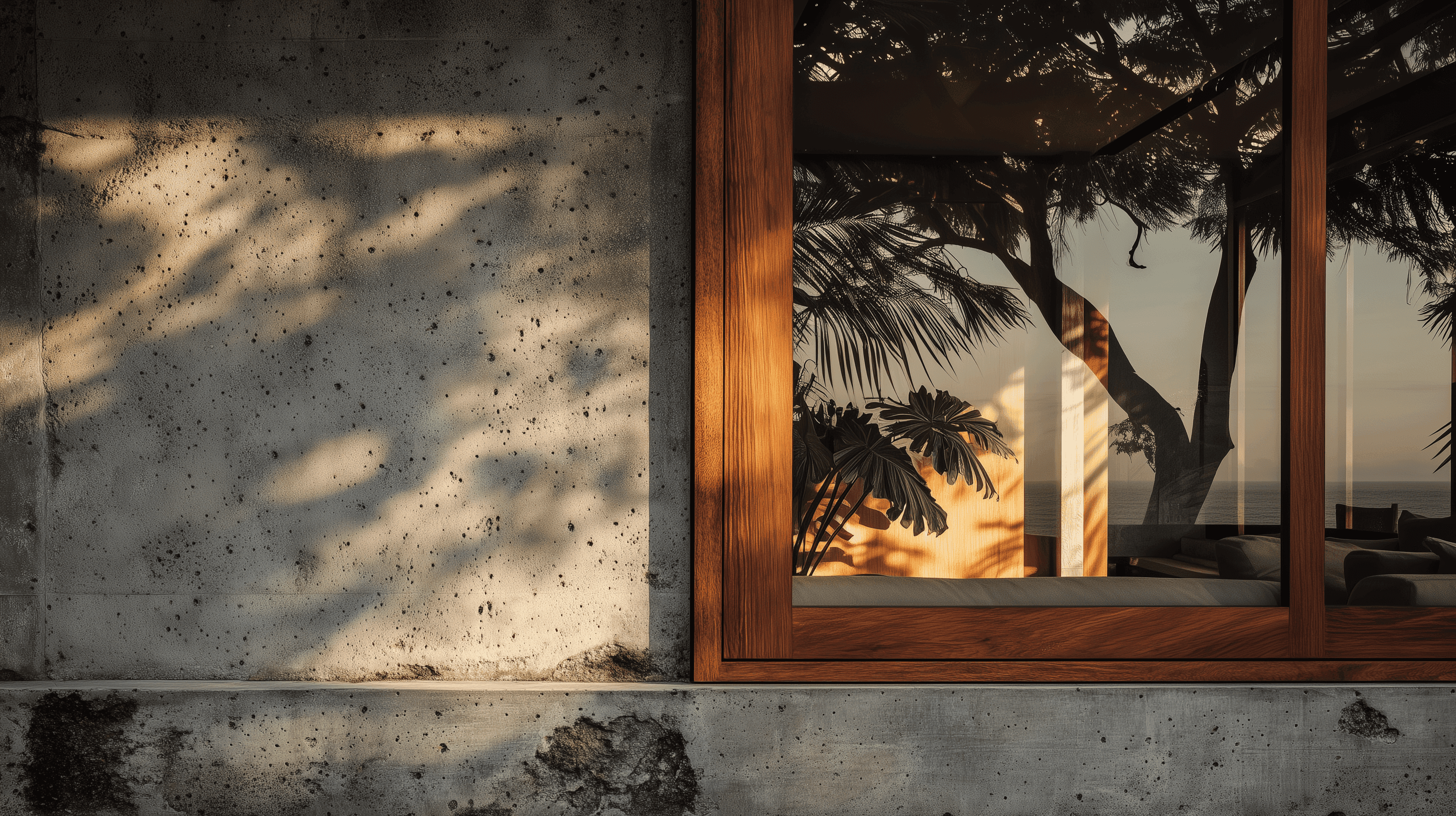 Tactile Contrast: The deliberate juxtaposition of the "Raw" (Board-marked concrete, weathered steel) against the "Refined" (Polished glass, honed basalt, oiled teak). This contrast highlights the inherent beauty of each material.